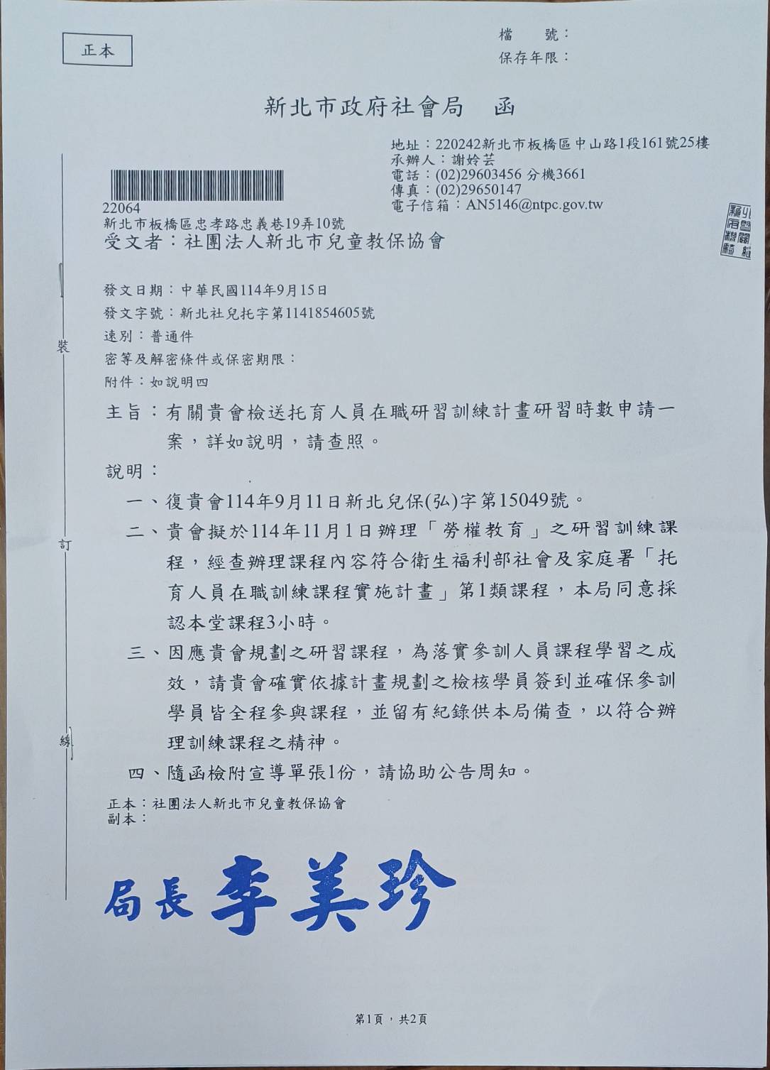 全程參與者由新北市政府教育局/社會局核發「勞權教育」時數3小時。